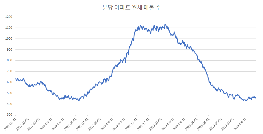마지막으로 분당 아파트 월세 매물 수는 전저점까지 감소 후에 횡보를 하고 있습니다.