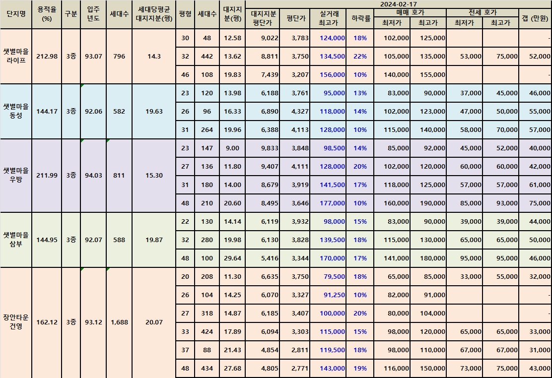 분당동 샛별마을과 장안타운 아파트의 매매가와 전세가를 전수 조사 후 동향 파악을 위해 한 달 전 데이터와 비교했습니다.