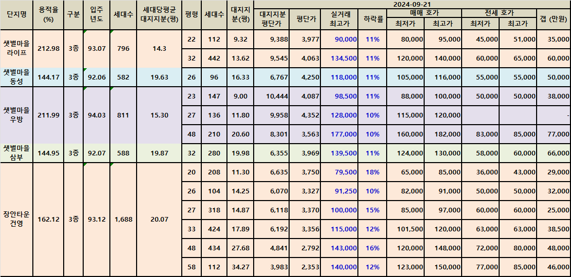 분당동 샛별마을과 장안타운아파트의 매매가를 전수 조사 후 매매 최저가가 실거래가 최고가 대비 10% 이상 하락한 매물을 정리했습니다.