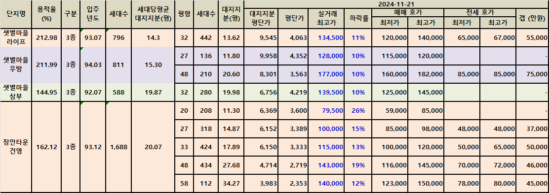 분당동 샛별마을아파트와 장안타운아파트의 매매가를 전수 조사 후 매매 최저가가 실거래가 최고가 대비 10% 이상 하락한 매물을 정리했습니다.