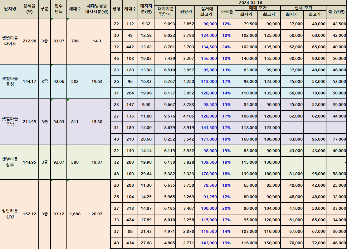 분당동 샛별마을과 장안타운아파트의 매매가와 전세가를 전수 조사 후 한 달 전 데이터와 비교했습니다.