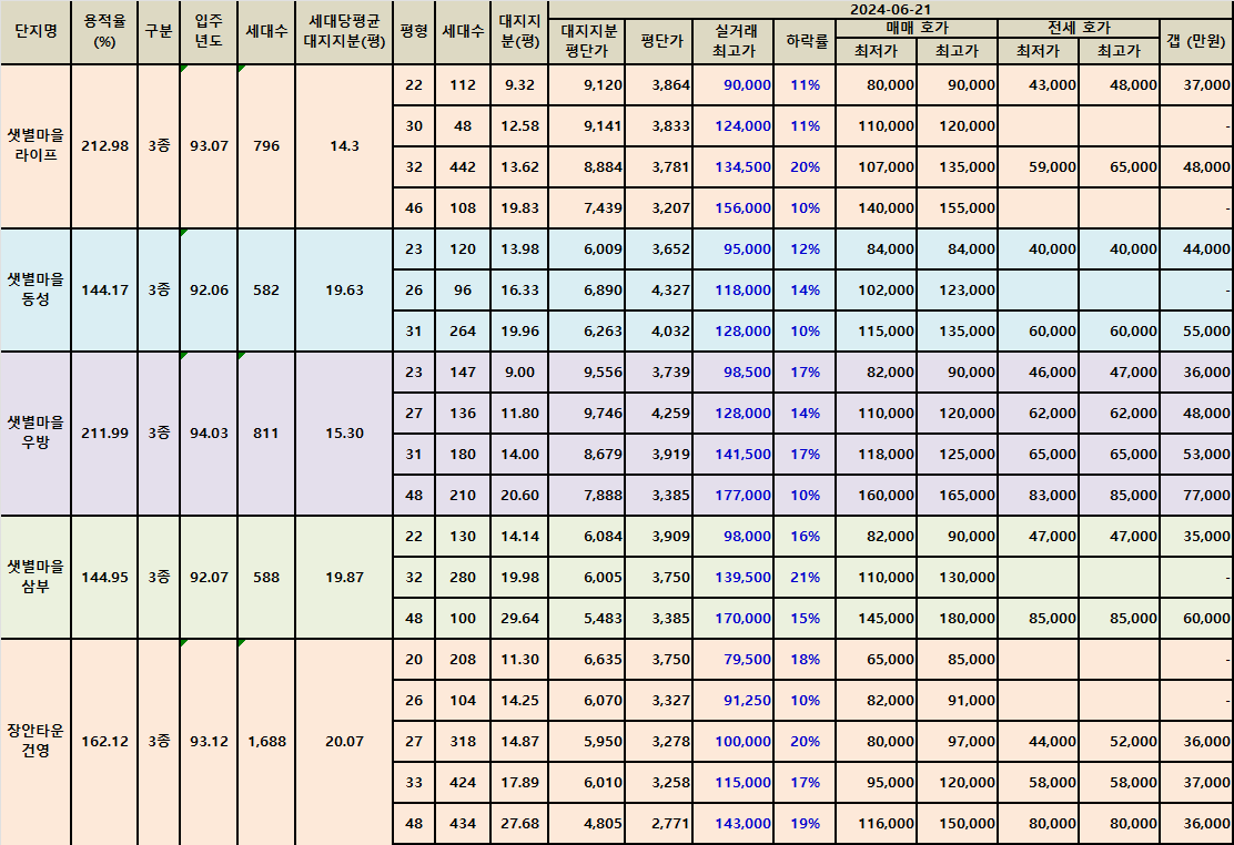 분당동 샛별마을 및 장안타운아파트의 매매가와 전세가를 전수 조사 후 한 달 전 데이터와 비교했습니다.