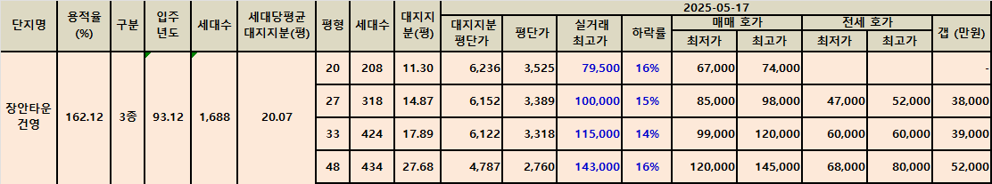 아래 표에서와 같이 샛별마을아파트에는 급매물이 없었으며, 장안타운에만 몇 건이 있었습니다.