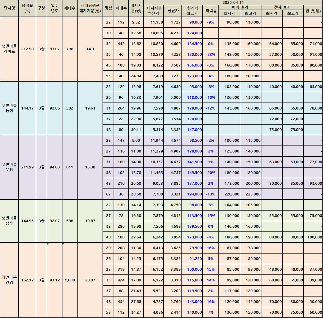 분당동 장안타운아파트와 샛별마을아파트의 매매가를 전수 조사 후 매매 최저가가 실거래가 최고가 대비 10% 이상 하락한 매물을 정리했습니다.
