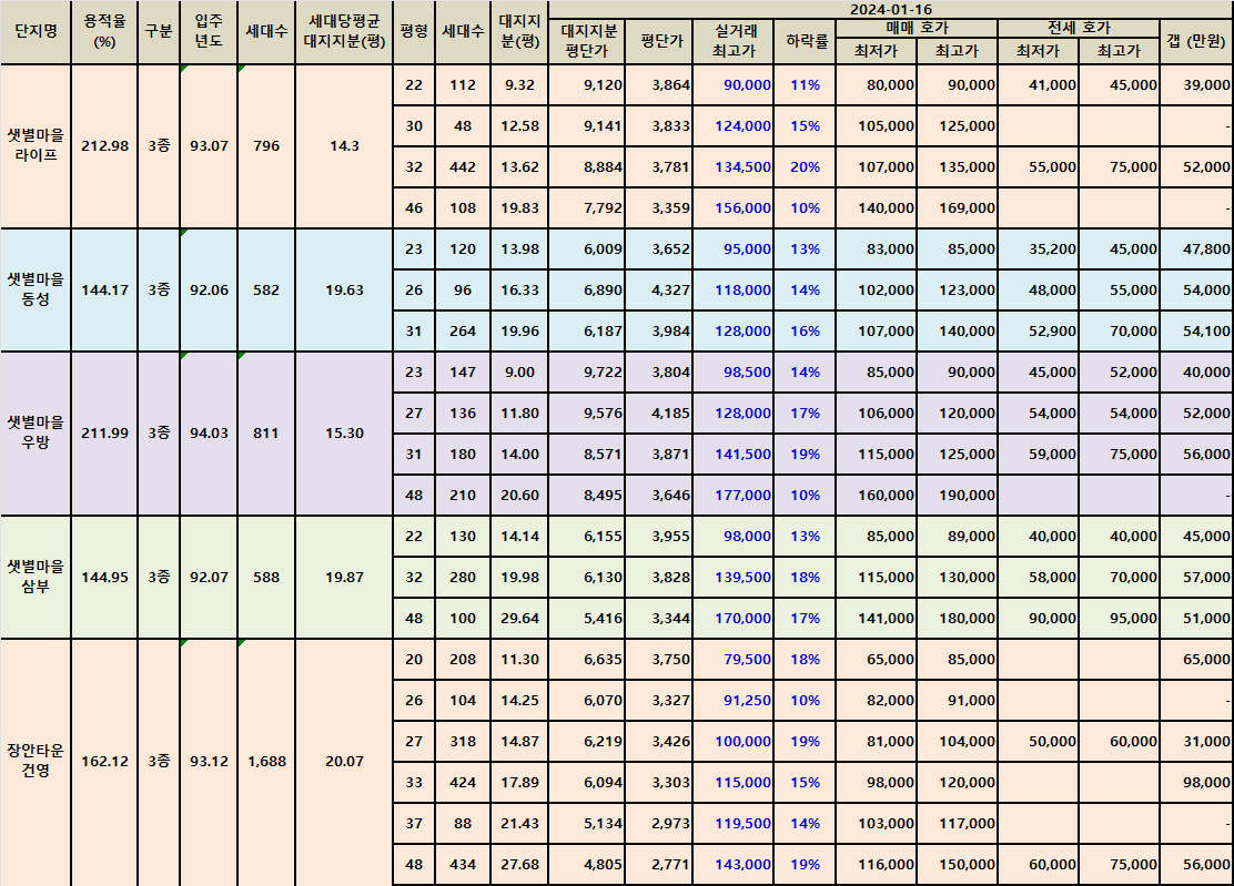 분당동 샛별마을아파트와 장안타운 아파트의 매매가와 전세가를 전수 조사 후 매매 최저가가 실거래가 최고가 대비 10% 이상 하락한 매물을 정리했습니다.