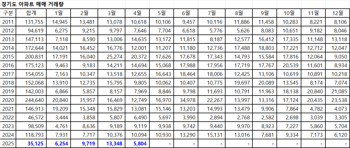 아래 표는 경기도아파트 매매 거래량입니다.