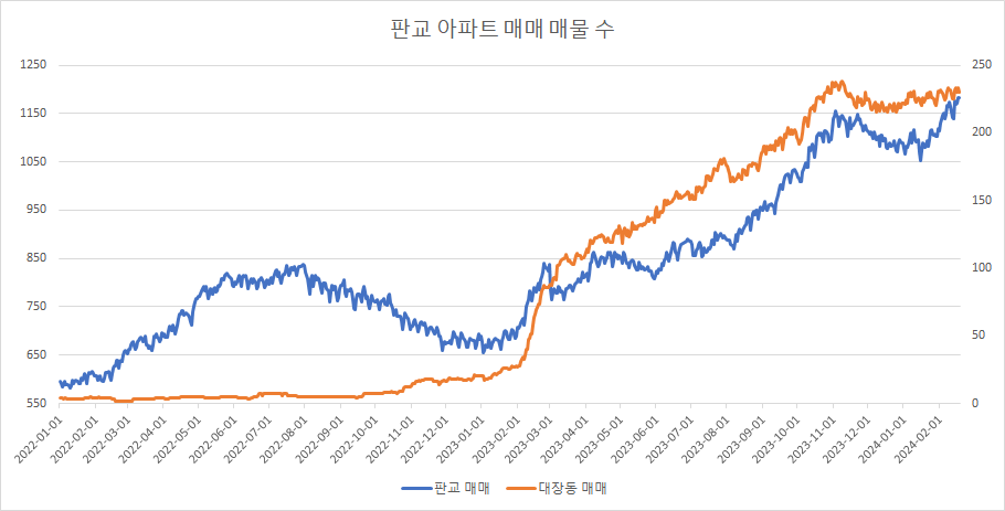 대장동 아파트 매매 매물 수는 2주 연속 증가하고 있습니다.