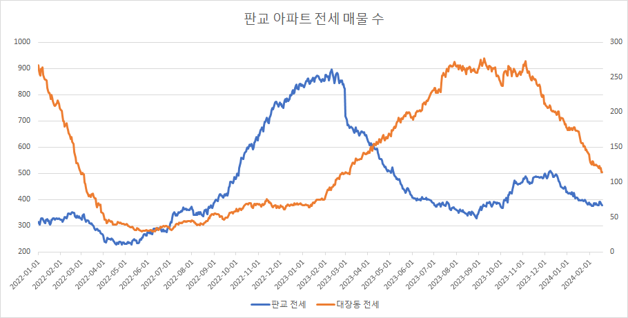 다음은 분당구 아파트 전세 매물 수 변화입니다.