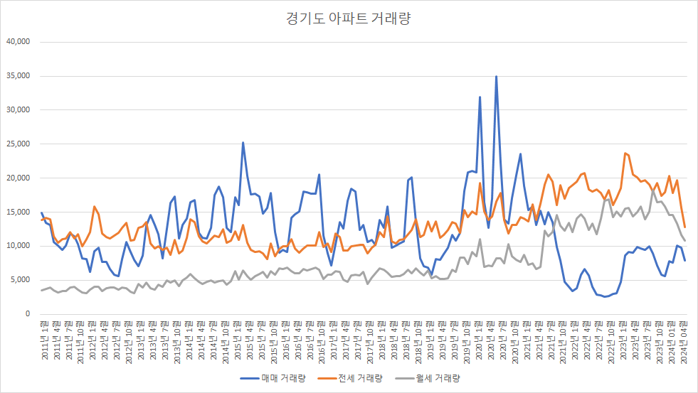 경기도아파트 매매 거래량은 4월 1만 건 돌파 후 3개월 연속 한 템포 쉬어가는 모습을 보이는 것 같습니다.