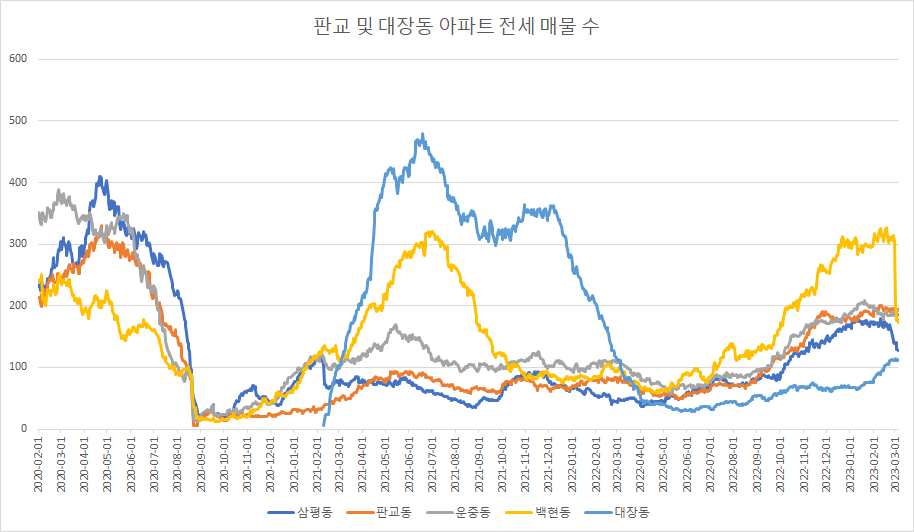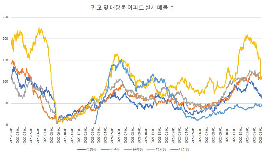 대장동과 판교의 아파트 월세 매물 수 변화입니다.