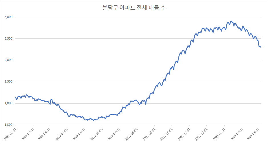 이어서 분당구 아파트의 전세 및 월세 매물 변화를 확인해 보겠습니다.