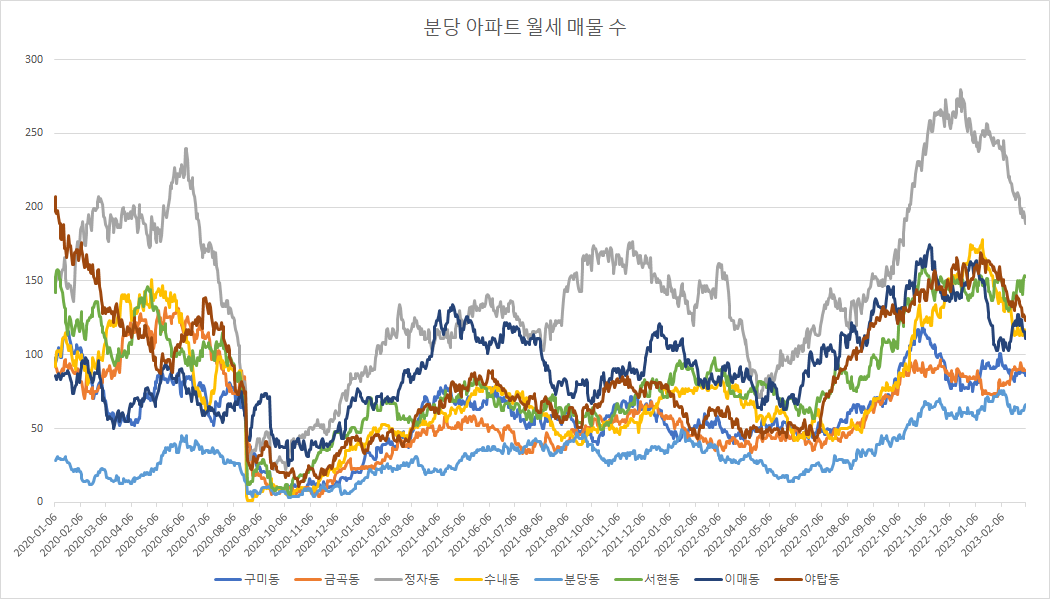 분당 각 지역별로 월세 매물 수의 변화를 확인해 보겠습니다.