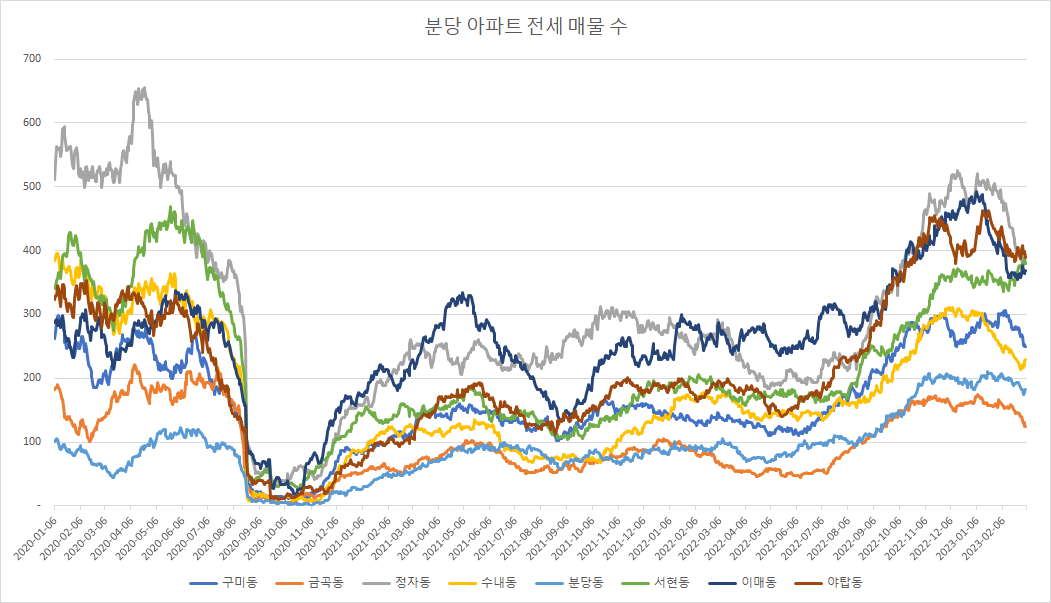 분당 지역별로 전세 매물의 변화를 확인해 보면,