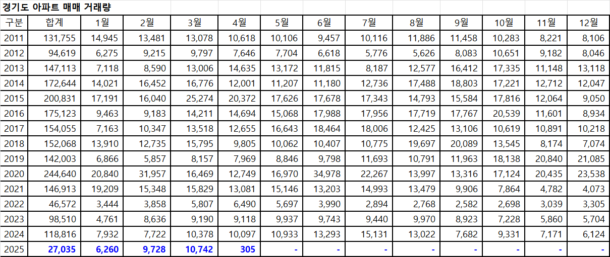 4월 경기도아파트 매매 거래량은 현재 305건입니다. 아직은 모수 부족으로 신뢰도가 낮기는 하지만, 그럼에도 이 데이터로 4월 경기도아파트 최종 매매 거래량을 예측해 보면, 약 13,289건이 됩니다.