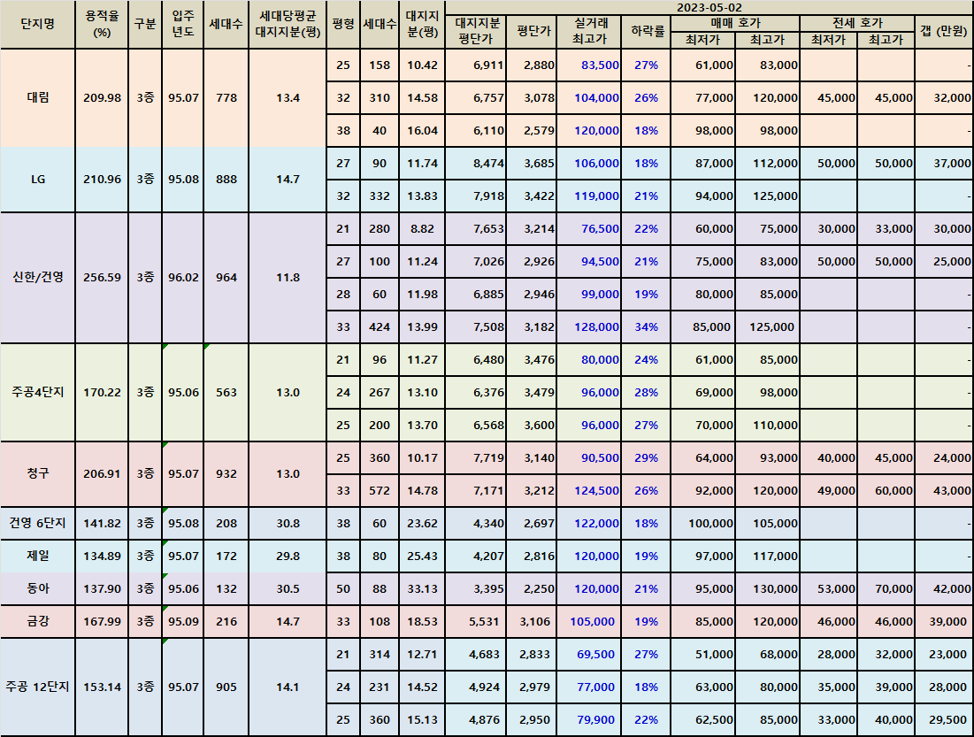 먼저 구미동 무지개마을 모든 아파트의 매매가 및 전세가를 조사합니다.