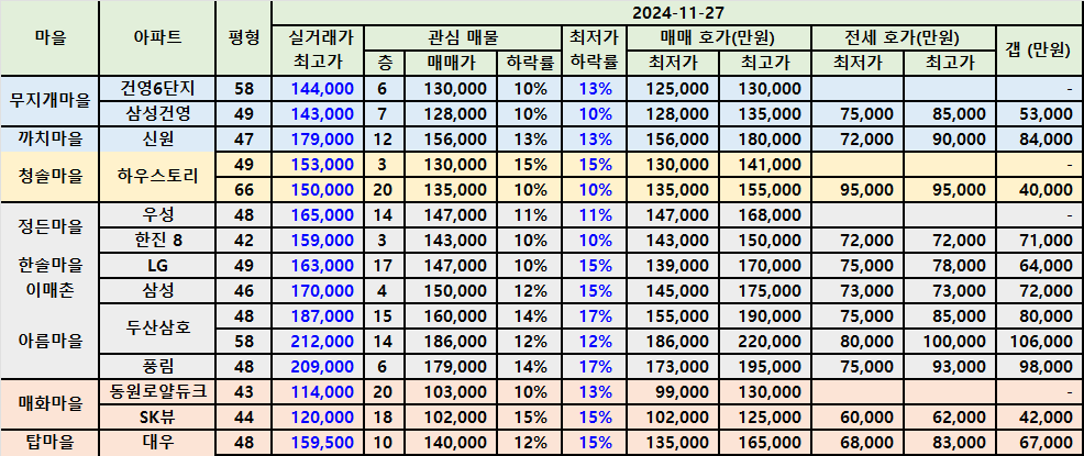 | 분당동 샛별마을과 장안타운아파트 급매물 시세 2411 (2) | 2024.11.22 |
