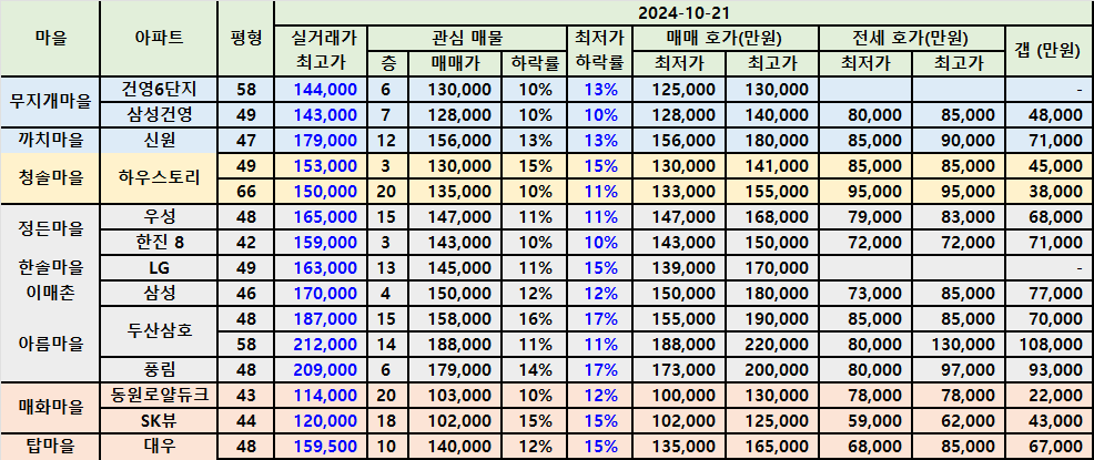 | 분당동 샛별마을 & 장안타운 아파트 급매물 시세 2410 (2) | 2024.10.18 |
