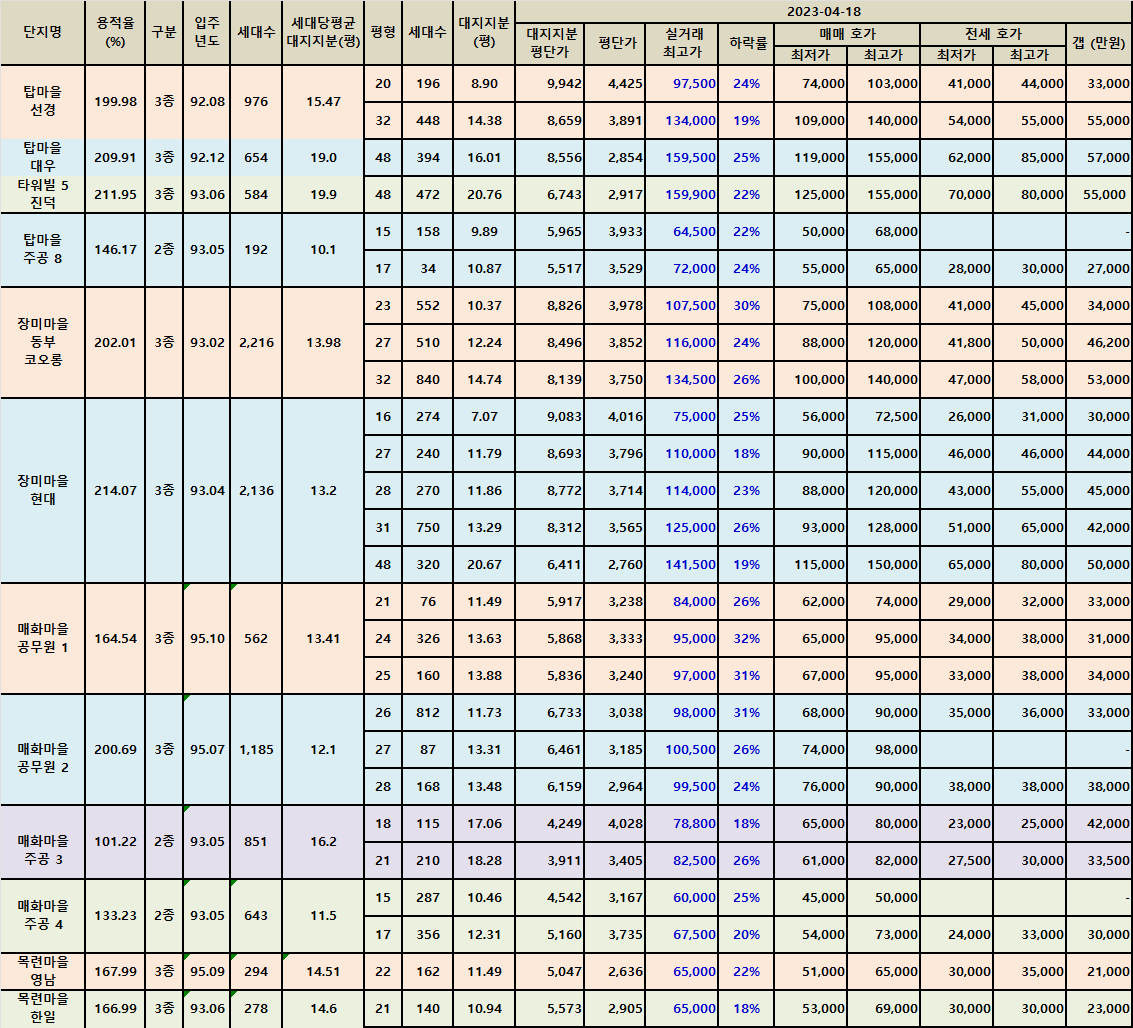 매월 1회씩 각 마을 별 매매 및 전세 매물을 정리하고 실거래가 최고가 대비 매매 최저가가 18% 이상 하락한 매물을 급매물로 분류하여 정리하고 있습니다.