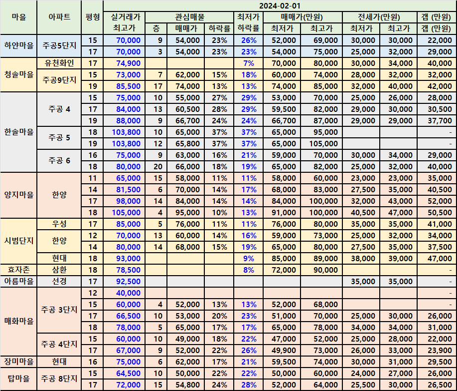 아래 표를 작성 후에 한 달 전 대이터와 비교를 했을 때, 매매 최저가 또는 관심 매물이 사라 진 곳이 꽤 있었습니다.