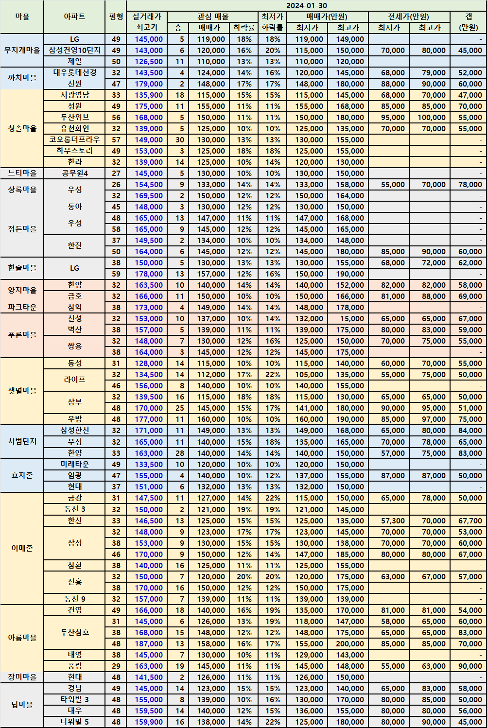 매물 정리 후 한 달 전 데이터와 비교하는데, 매매 최저가 또는 관심 매물이 사라진 곳이 많았습니다.