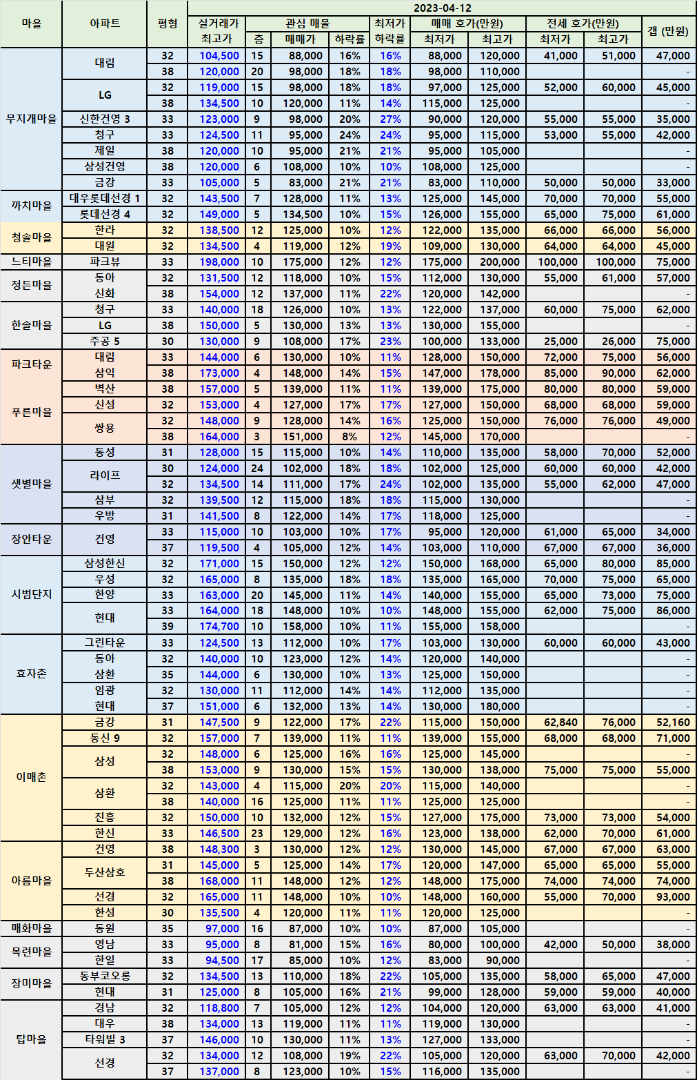 아래 표를 보면, 아직도 일부 마을에 국한되기는 하지만, 매매 최저가가 실거래가 최고가 대비 20% 이상 하락한 매물이 있습니다.