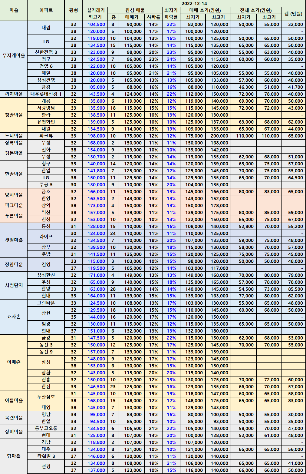 매물을 정리하면서 한달 전 데이터와 비교를 해 보는데, 매매 최저가가 하락한 곳이 상승한 곳보다 더 많았습니다