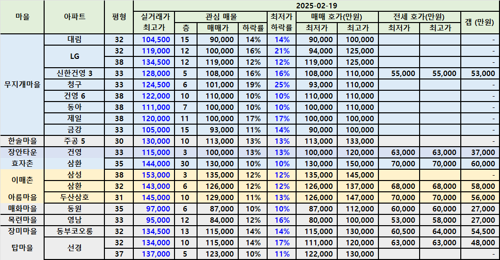 이후 이러한 실거래가 최고가 대비 10% 이상 하락한 매물이 1충과 2층의 저층 매물만 있는 곳도 추가로 제거 후 아래 표를 작성했습니다.