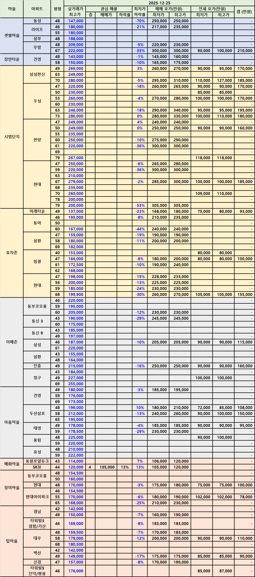 매매 최저가가 업데이트된 곳이 일부 있었으나, 실거래가 최고가가 업데이트된 곳은 몇 곳 없었습니다.