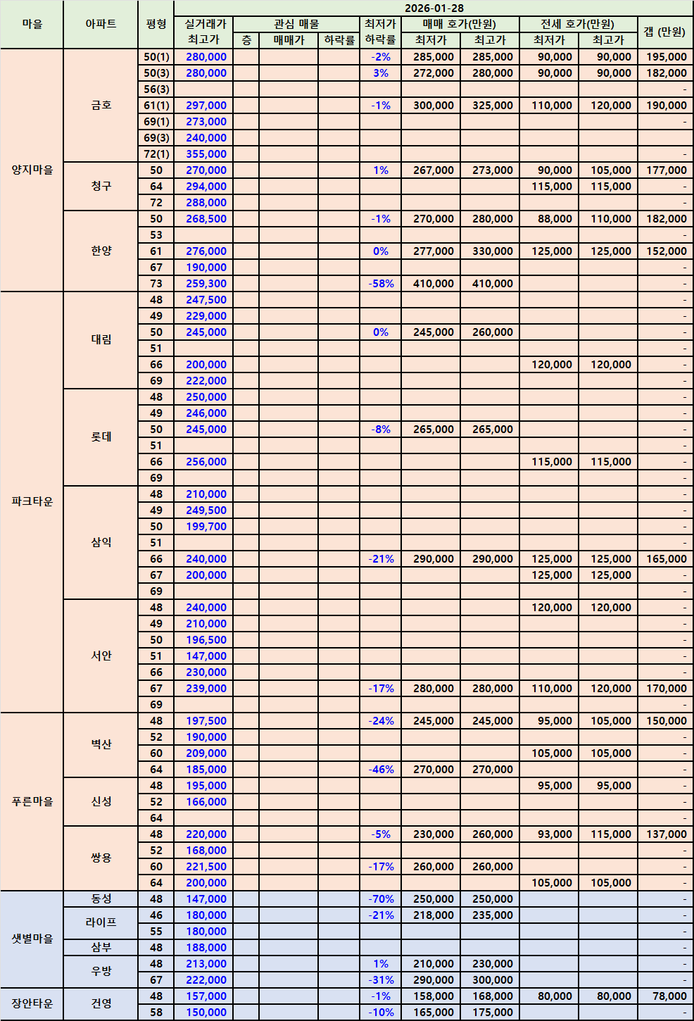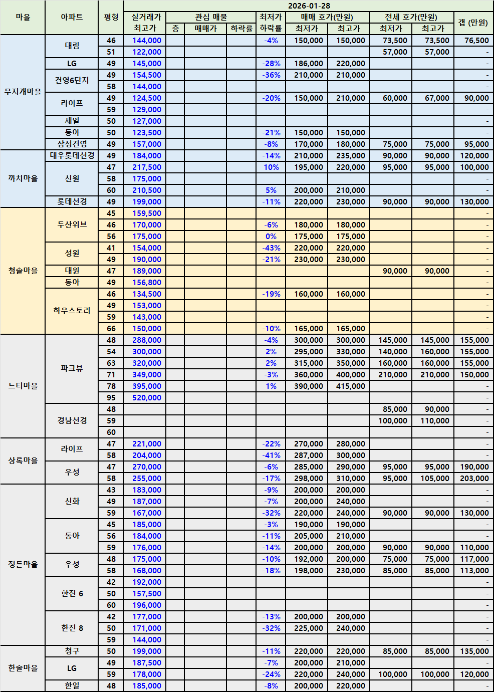 매매 최고가가 갱신되거나, 매매 최저가가 사라진 곳이 몇 곳 정도 보였습니다.
