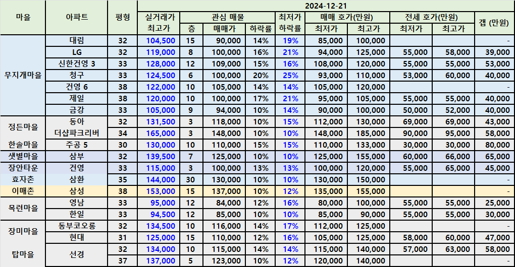 이후, 이렇게 10% 이상 하락한 매물 중에서 저층인 1층과 2층을 제외한 매물 중에서 먼저 거래가 될 가능성이 높은 매물을 관심매물로 정리했습니다.