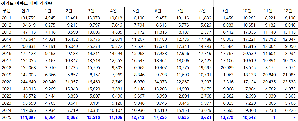 10월 경기도아파트 매매 거래량은 현재 10,542건입니다. 이 데이터로 10월 경기도아파트 최종 매매 거래량을 예측해 보면, 약 16,611건이 됩니다.