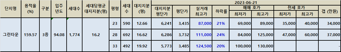 실거래가 최고가 대비 매매 최저가가 18% 이상 하락한 곳은 그린타운 23평과 28평 두 곳이 전부입니다.