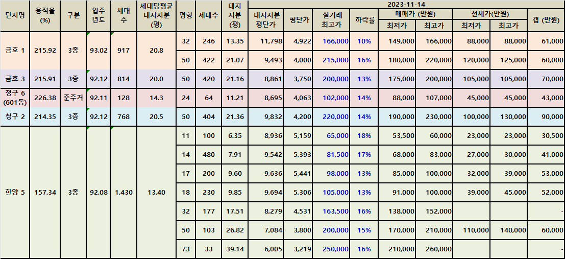 아래 표에서 한양아파트 11평과 14평 10% 후반대의 하락율을 보이는 매물은 저층 매물입니다.