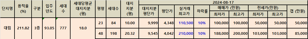 또한, 대림아파트 48평 18.8억 원의 실거래가 최고가 대비 10% 하락한 매물은 3층 매물입니다.