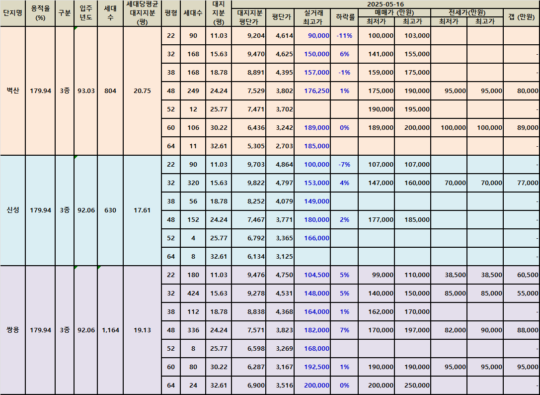 아래 표는 급매물이 없어서 수내동 푸른마을아파트 전체 시세표입니다.