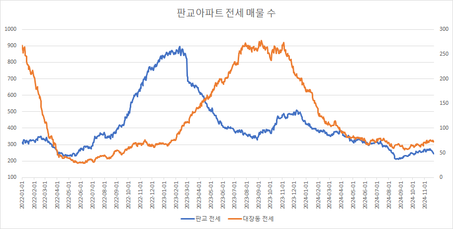 판교아파트 전세 매물 수는 2주 연속 감소했습니다.