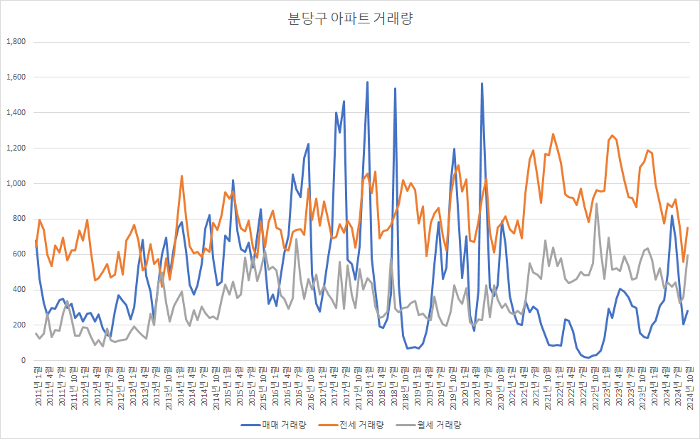 10월 이후 경기도아파트 및 분당구아파트 매매 거래량이 지속 감소하고 있습니다.