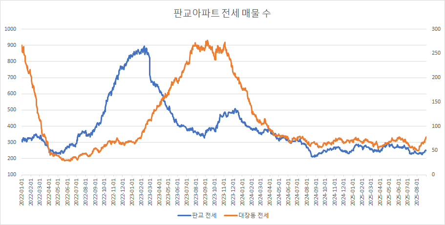 대장동아파트 전세 매물 수는 2주 연속 증가하고 있습니다.