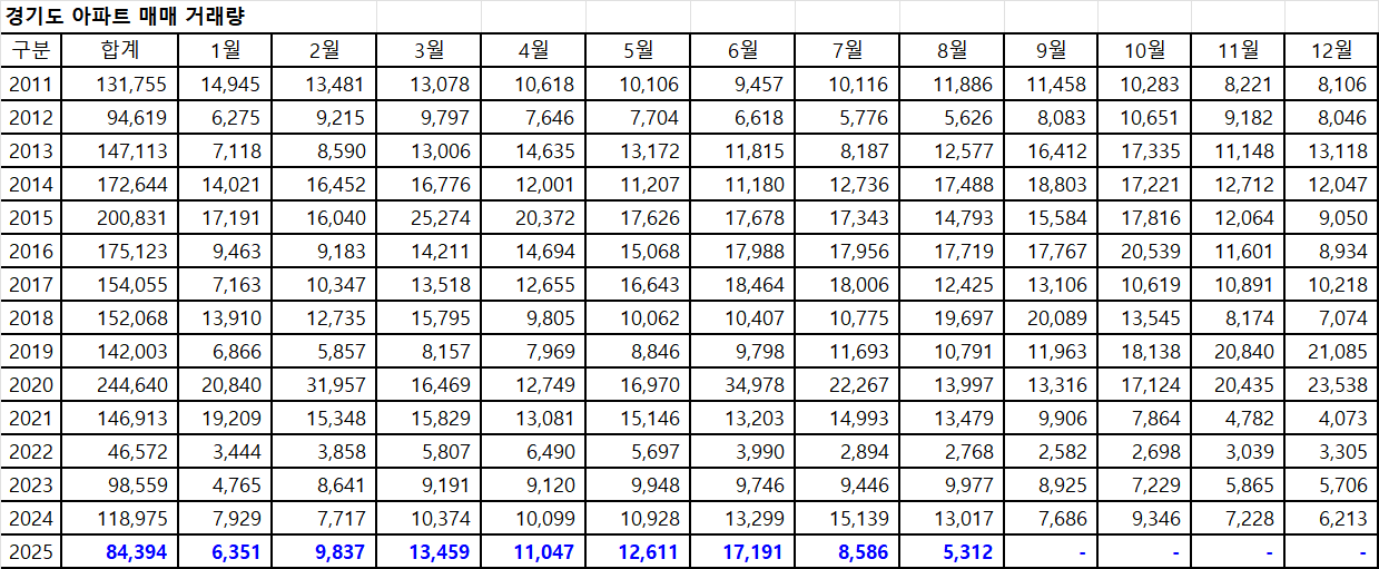 아래 표는 경기도아파트 매매 거래량입니다.