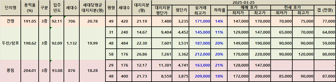 아래 표에서 매매 최저가가 실거래가 최고가 대비 20% 이상 하락한 3개의 매물과 18% 하락한 매물에 대해서 확인해 보겠습니다.