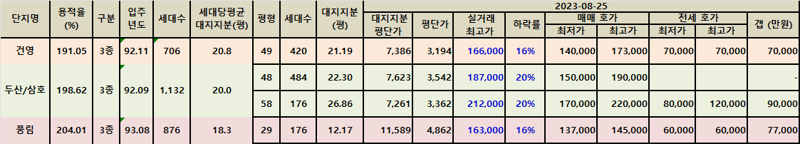 이매동 아름마을 아파트 매매가 및 전세가를 전수 조사 후에는 늘 한 달 전 데이터와 비교를 합니다.