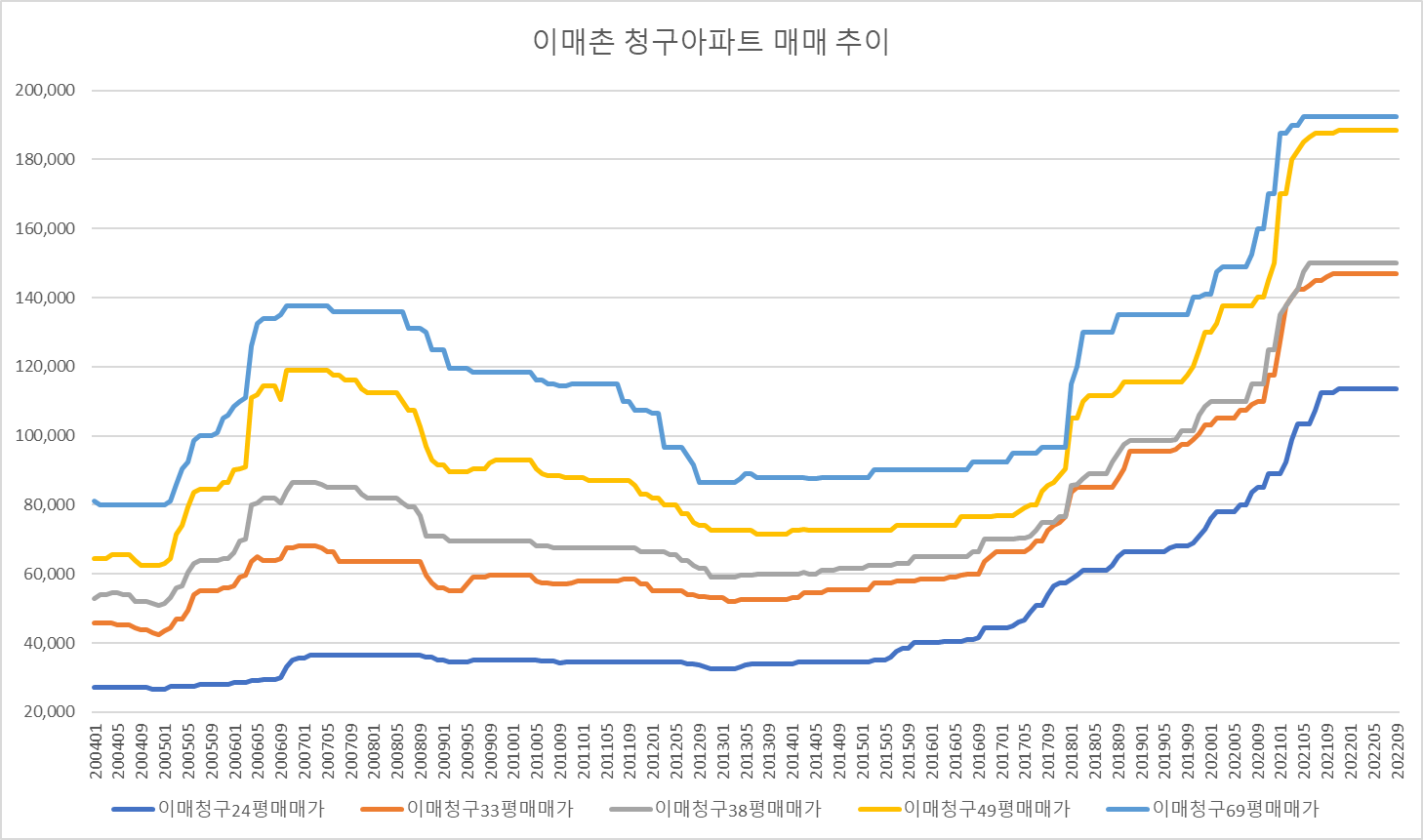 69평과 49평의 매매가가 크게 차이가 나지 않고 있고, 32평과 38평의 매매가 또한 비슷 합니다.