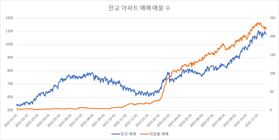 대장동 아파트 매매 매물 수는 본격 감소를 시작하는 모습입니다.