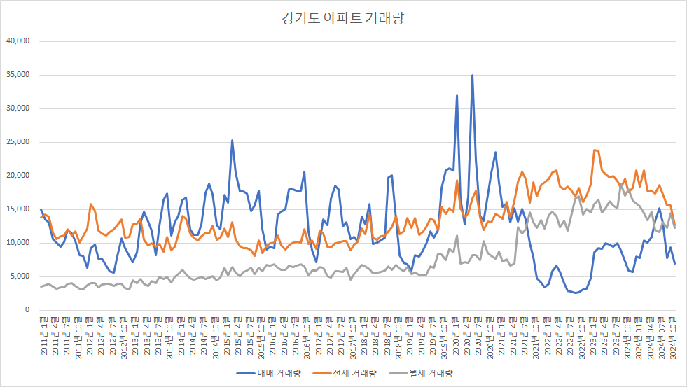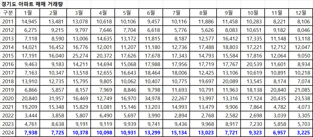 아래 표는 경기도아파트 매매 거래량입니다.