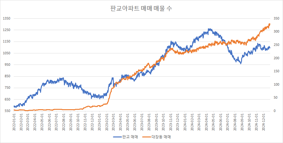 대장동아파트 매매 매물 수는 증가 추세를 만들어 가고 있는데, 지난주 감소 후 이번주에는 다시 증가했습니다.
