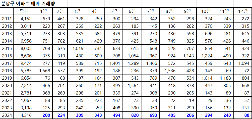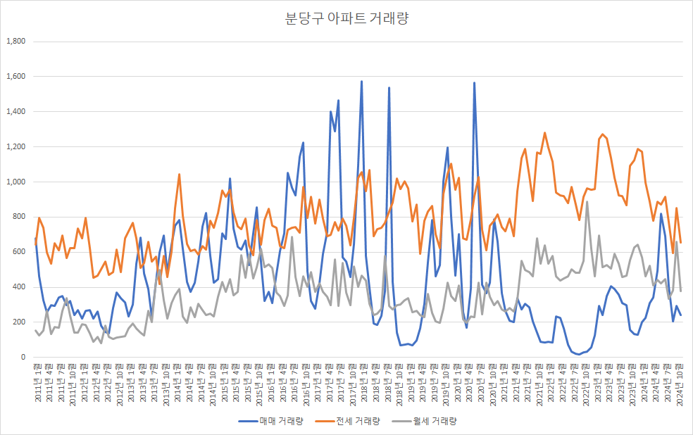 11월 분당구아파트 매매 거래량은 현재 240건입니다. 이 데이터를 기반으로 11월 분당구아파트 최종 매매 거래량을 예측하면 약 241건이 됩니다. 10월 거래량보다 감소한 것은 아쉽지만, 9월 거래량 바닥을 지켜낸 것은 그나마 다행으로 보입니다.