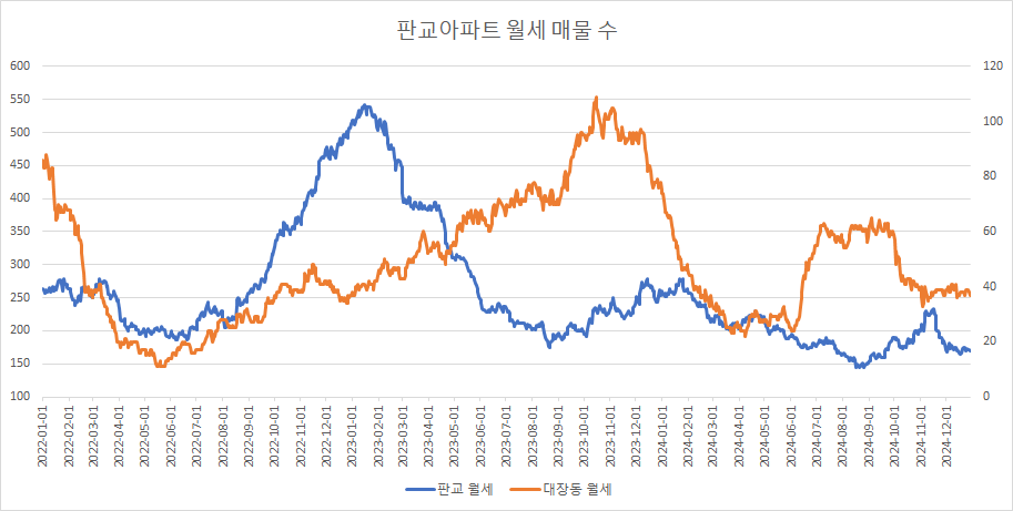 대장동아파트 월세 매물 수는 2주 연속 보합을 유지하고 있습니다.