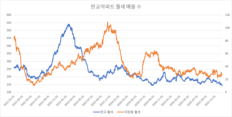 대장동아파트 월세 매물 수는 2주 연속 큰 폭으로 감소했습니다.