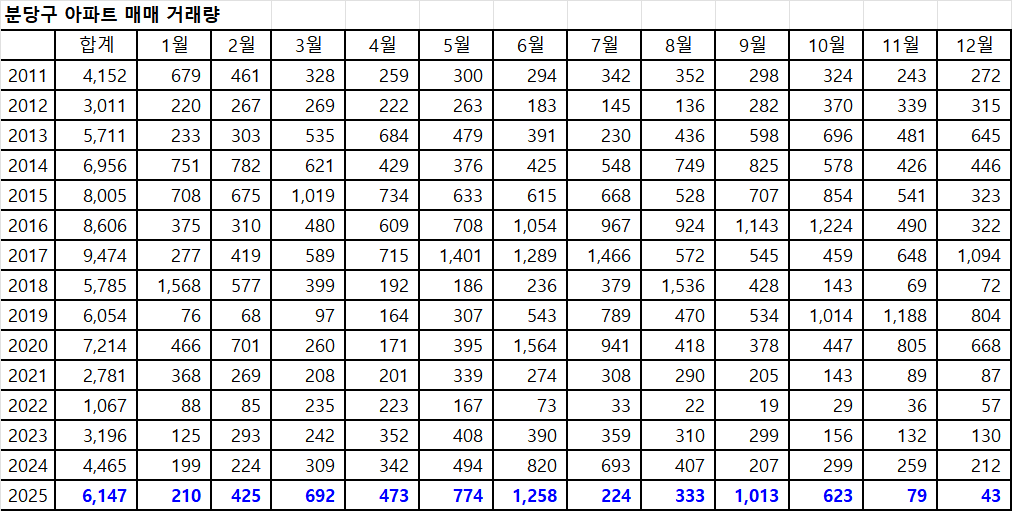 12월 분당구아파트 최종 매매 거래량이 210건이면, 분당구아파트 매매 시장이 크게 위축되어 있을 때의 거래량입니다.