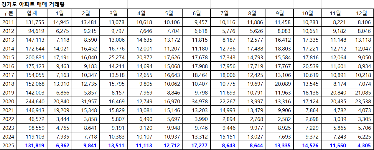 아래표는 경기도아파트 매매 거래량입니다.